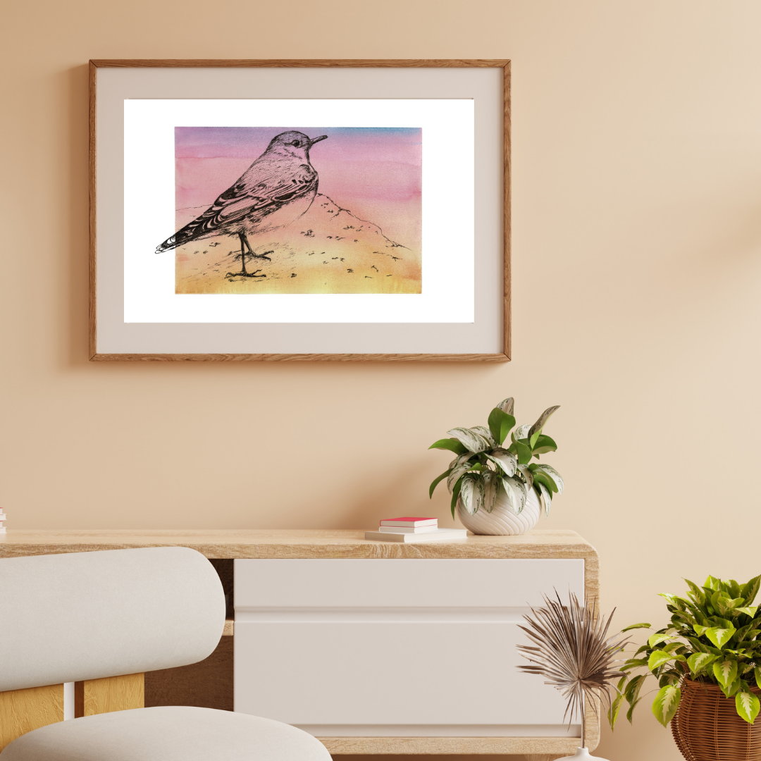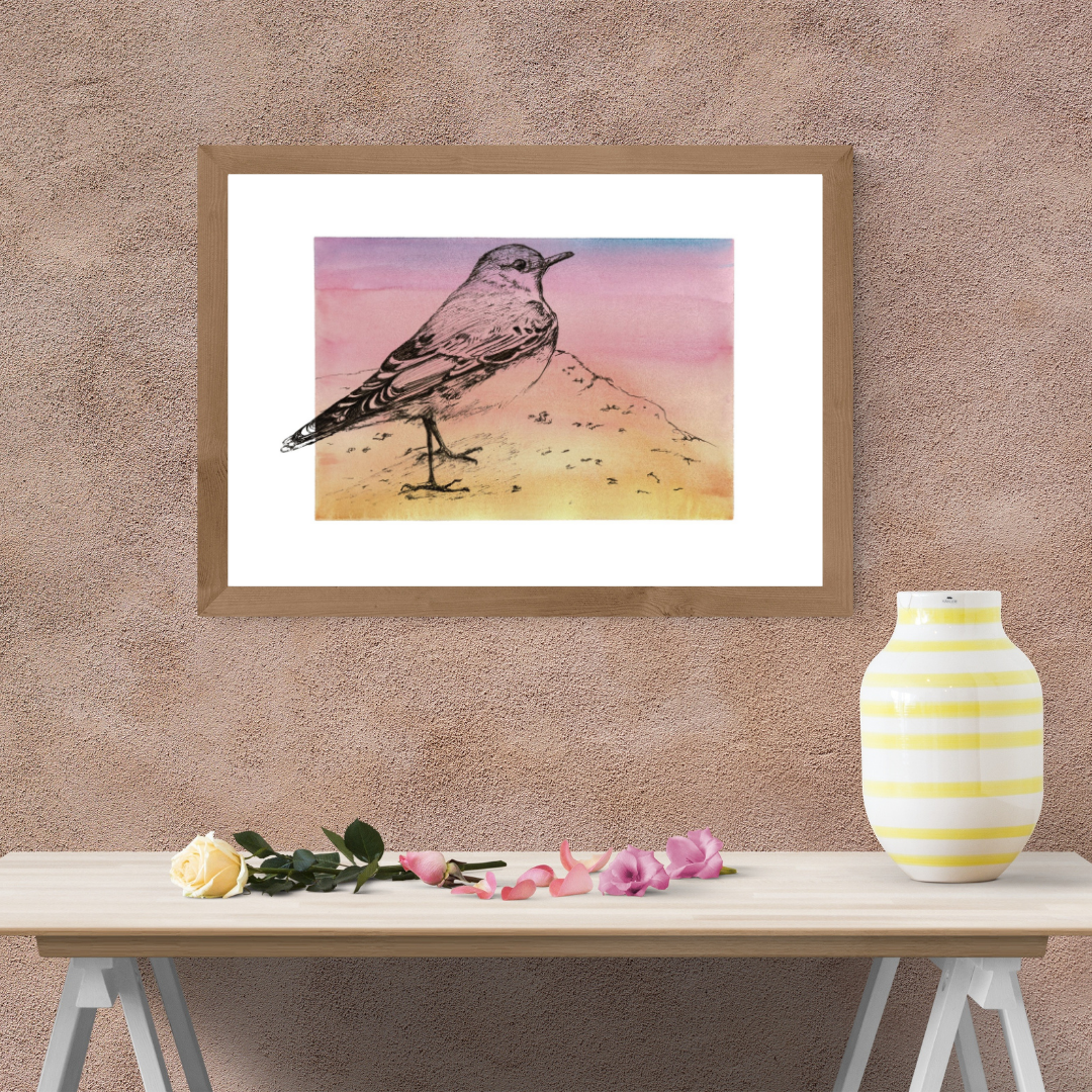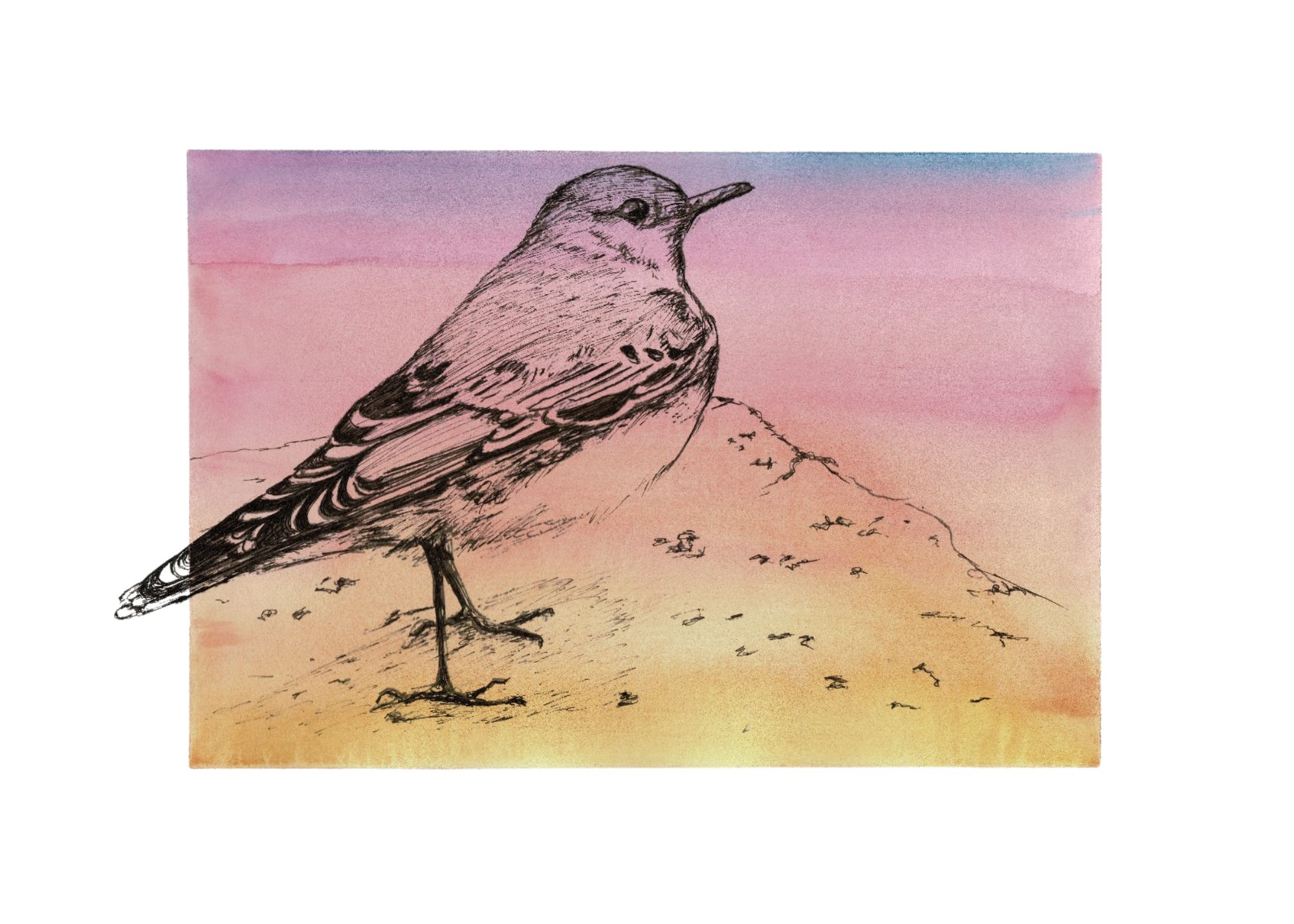 The drawing features bold black ink details of the wheatear perched against a stunning watercolour wash, graduating from soft pink to warm, soft sandy tones, reminiscent of a breathtaking sunrise. The vibrant hues create a perfect backdrop for this bird’s charm and character, bringing the beauty of nature to life on paper.
