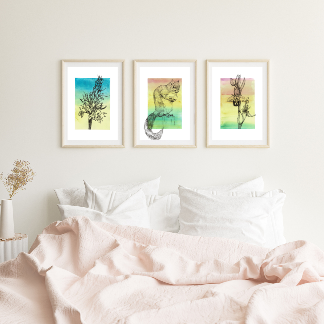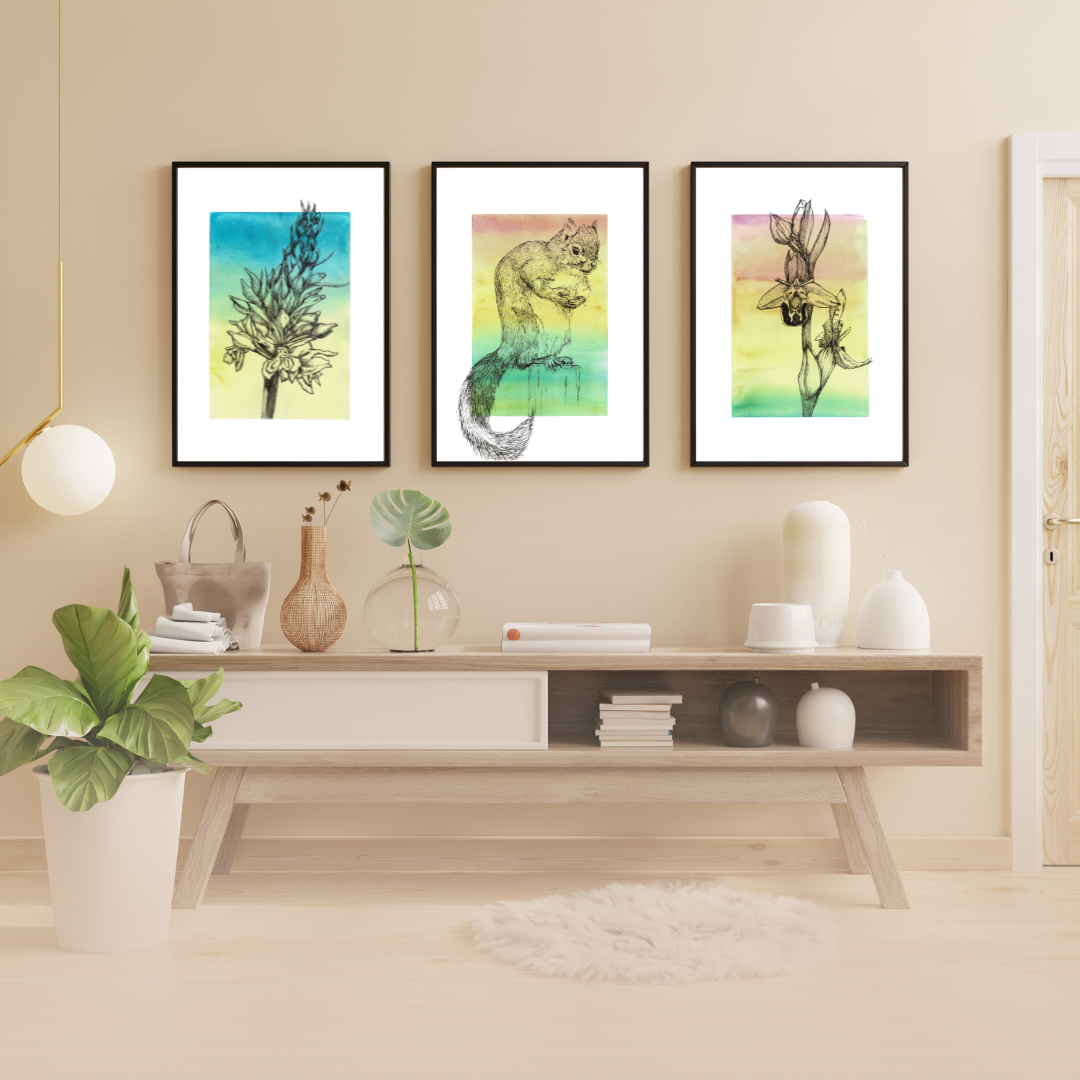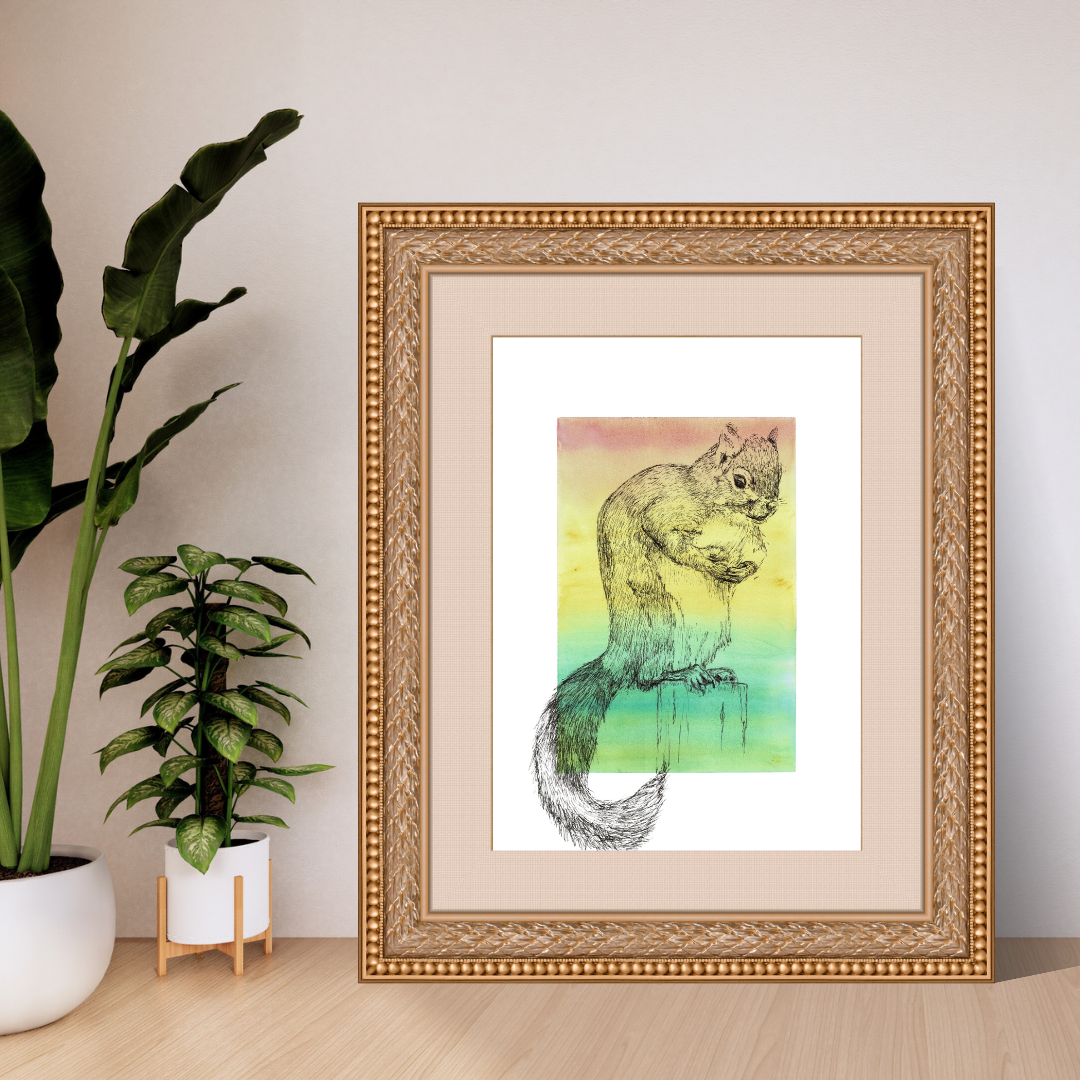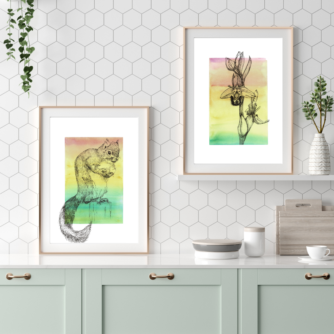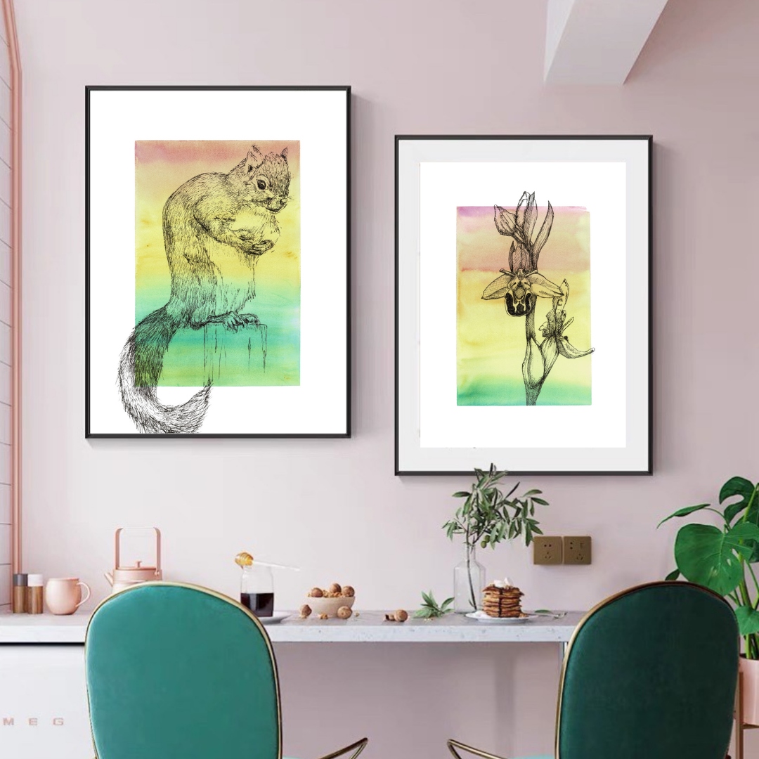 Inspired by the energetic squirrels that scurry through the countryside and urban parks and gardens, this ink with watercolour wash artwork brings a touch of vibrancy and adventure to your walls. The gradient of colours gives it a sense of warmth and vitality, perfect for adding a pop of colour to any room.