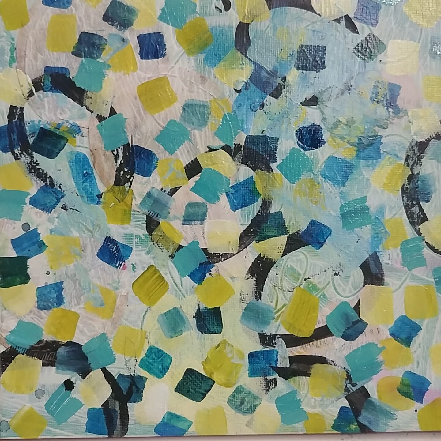 Squares I is part of the ongoing Journey Into Colour series.  It is a small mixed media piece created with many layers of paint, ink and pencil.    The final layer of small squares gives the feeling of secrecy by hiding the early layers, but still allowing something to show through.  For some reason I love the feeling of painting squares and it has a light, fun element about it.